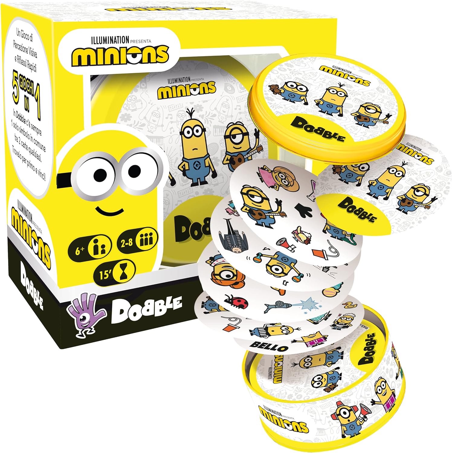 Pour gagner, vous devez être le plus rapide à trouver le seul symbole commun parmi les cartes dévoilées. 5 mini jeux pour des matchs toujours différents et passionnants. Dobble est simple, rapide et se joue immédiatement. La boîte en métal de taille réduite permet d’emmener le jeu partout. Jouez à Dobble avec les personnages et les graphismes des Minions