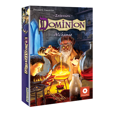 Troisième extension de Dominion, Alchimie propose 12 nouvelles cartes Royaume ainsi qu’une nouvelle ressource : les Potions. Ces nouvelles cartes Trésor sont payantes. Certaines cartes Royaume (action) ne peuvent être achetées qu’en cumulant cartes Trésor traditionnelles et Potions, ces cartes pourront, tout comme les trésors, servir à acheter de nouvelles cartes. Sans potions, on ne peut se les procurer. Uniquement jouable associée au jeu de base ou à L’Intrigue, l’extension Dominion Alchimie ouvre la voie à de nouvelles stratégies et combos !