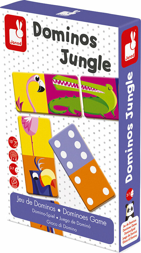 Jeu de dominos 2 en 1 avec deux possibilités de jouer : un côté illustré sur le thème des animaux de la jungle et un second côté chiffré pour un jeu classique. Idéal pour apprendre à compter et amuser petits et grands ! Règles du jeu version « Animaux » : on distribue 5 dominos à chaque joueur, le reste constitue la pioche. Pour commencer le jeu, prendre un domino de la pioche, le retourner et le placer au centre de la table. Il suffit de disposer les dominos les uns au bout des autres, de façon à ce que la tête de l’animal corresponde au corps de celui-ci. Lorsqu’un joueur ne peut pas poser de domino, il prend un domino dans la pioche et peut rejouer si le domino pioché peut être posé. Une bonne manière d’apprendre en s’amusant en famille.
