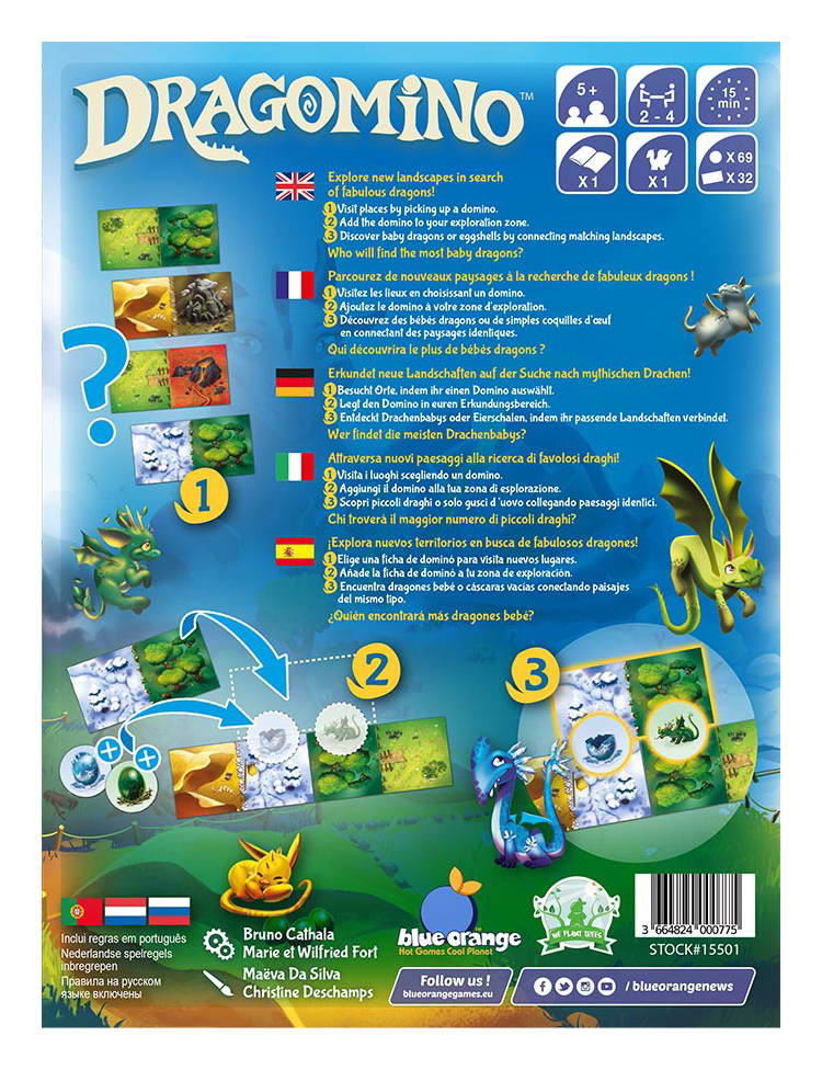 – Montrez vos découvertes : le joueur place son domino de façon a toucher son domino de départ. Pour chaque case du domino en contact avec une autre case on regarde si les paysages sont du même type ou non. Si c’est le cas, le joueur prend un Oeuf de Dragon du paysage correspondant. Il peut alors regarder ce qui se cache sur l’autre face. Si c’est un bébé Dragon, il rapporte 1 point. Si c’est une coquille d’oeuf, le joueur ne marque pas de point mais aura la possibilité de jouer en premier au prochain tour!
