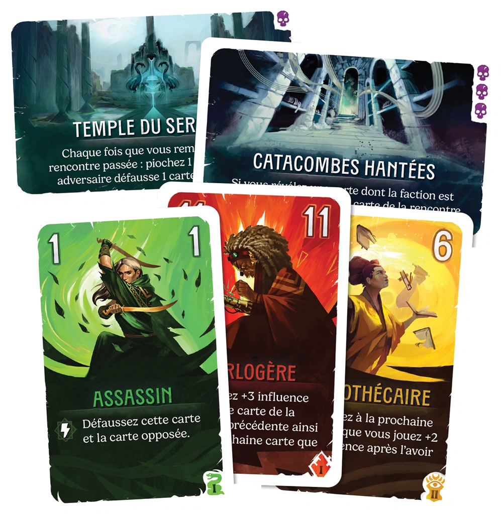 Dans votre deck et celui de votre adversaire, exactement les mêmes cartes : 16 personnages disposant d’une influence allant de 1 à 16 et de pouvoirs liés à leur faction. La Rebellion (vert) appauvrit le jeu de votre adversaire en lui faisant défausser des cartes de sa main ou de son deck. La Dynastie (bleu) vous donne (ou vous rend) l’avantage en manipulant l’issue des combats. L’Académie (jaune) use de magie pour transformer les éléments en présence, mais aussi ceux des duels passés et futurs. Enfin la Guilde (rouge) booste ou réduit l’influence de vos personnages pour inverser l’issue d’un combat.