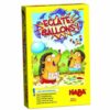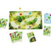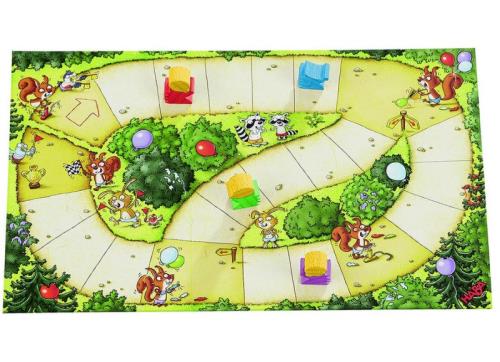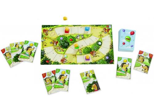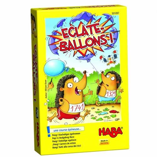 Contenu : 1 plateau de jeu en 3 morceaux à assembler (17 x 27,5 cm), 4 hérissons (ht. 1,6 cm) et 4 ballons en bois, 40 cartes (24 cartes Course – valeur de 1 à 3, 8 cartes Boum, 8 cartes Gonfleur), 1 règle.