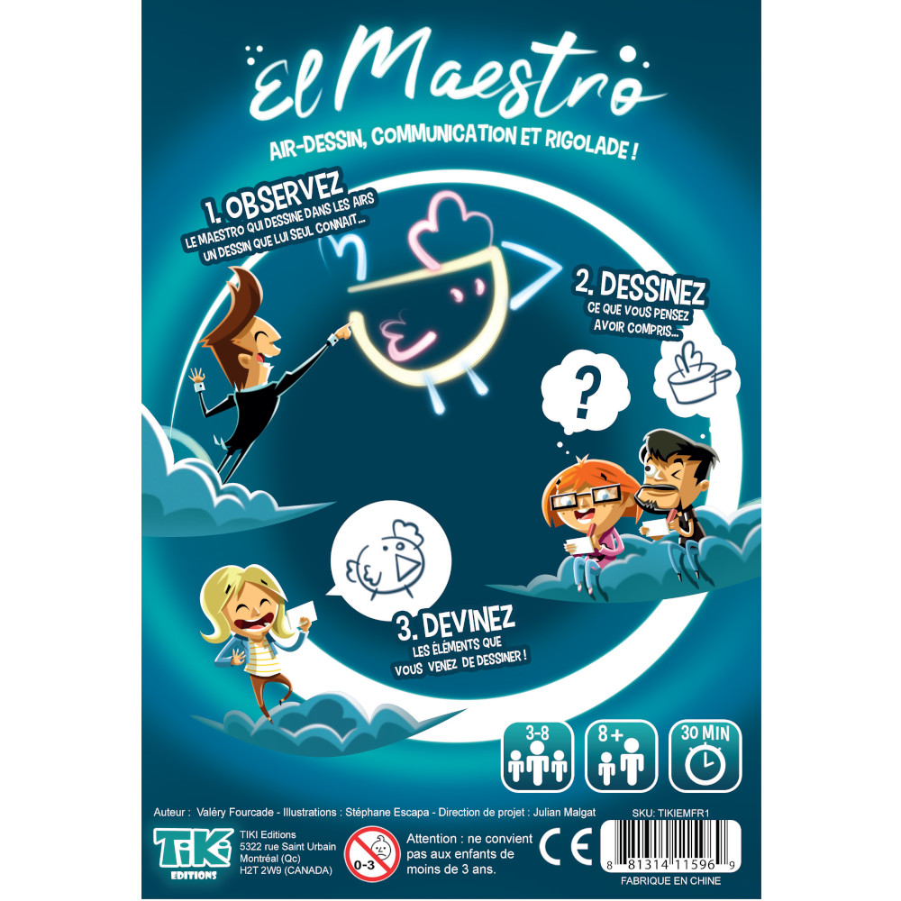 Son seul moyen ? Dessiner dans les airs ce qui figure sur sa carte en s’aidant des codes du Maestro pour associer les formes qu’il dessine ! Les autres joueurs doivent reproduire sur leurs fiches ce qui est air-dessiné.