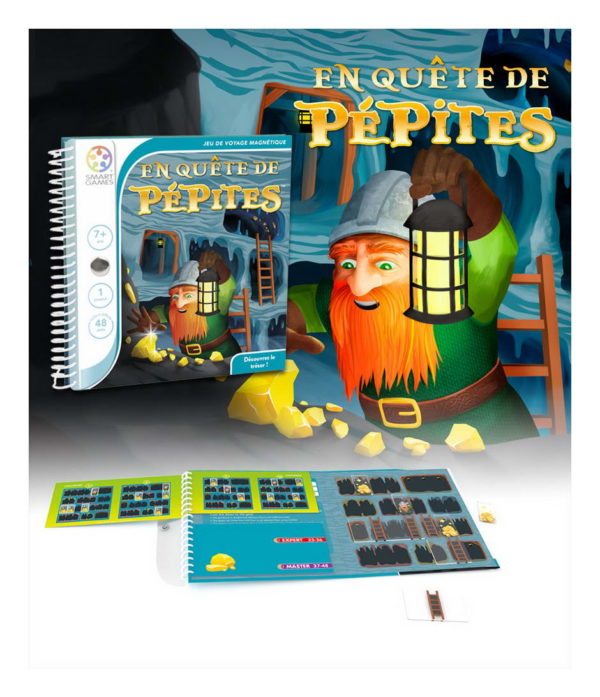 «En quête de pépite» est un jeu de voyage magnétique proposant 48 défis, avec 4 niveaux de difficulté (de facile à expert).