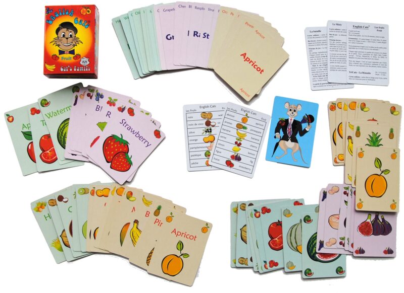 English Cats Fruit… est un jeu de cartes dynamique et ludique, mêlant Fruits, mémoire, concentration et rapidité. Apprenez le nom de 25 fruits en anglais en vous amusant ! Le jeu s’utilise du CP au Collège.