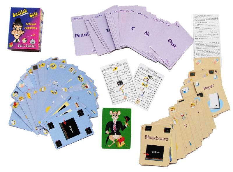English Cats School Supplies… est un jeu de cartes dynamique et ludique, mêlant matériel scolaire, mémoire, concentration et rapidité. Apprenez le nom de 25 objets en anglais en vous amusant ! Le jeu s’utilise du CP au Collège.