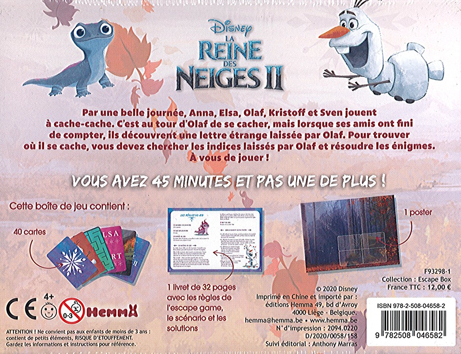 Dans Escape Box – La Reine des Neiges II, tentez de retrouver Olaf, grâce aux indices qu’il a laissé et partez à l’aventure avec tout(e)s vos ami(e)s !