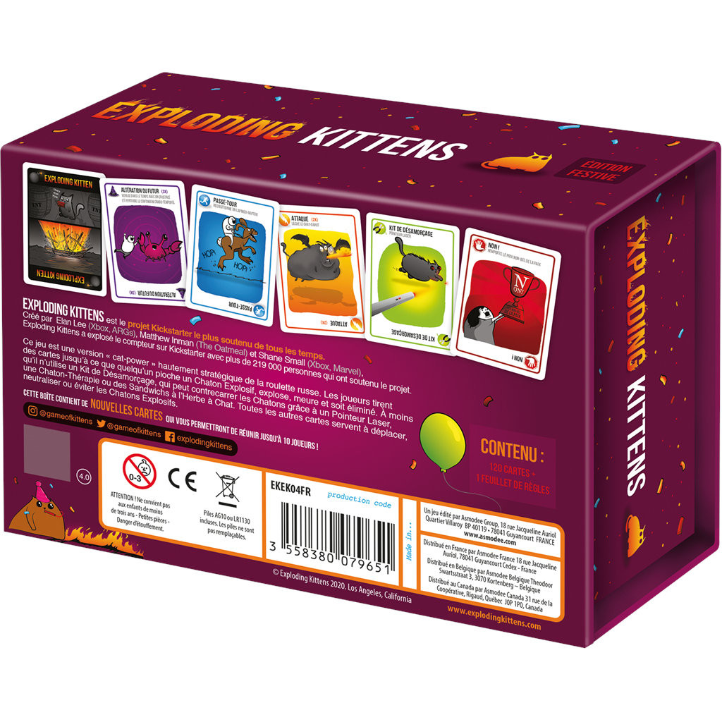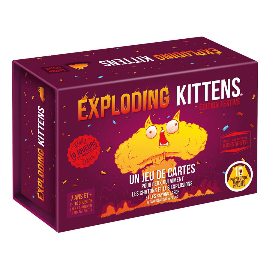 Retrouvez Exploding Kittens & Imploding Kittens dans cette édition du jeu avec des chats le plus célèbre. Vous pourrez y jouer de 2 à 10 grâce à l’App incluse. Exploding kittens, c’est Higlander avec des chatons : à la fin, il ne peut en rester qu’un.