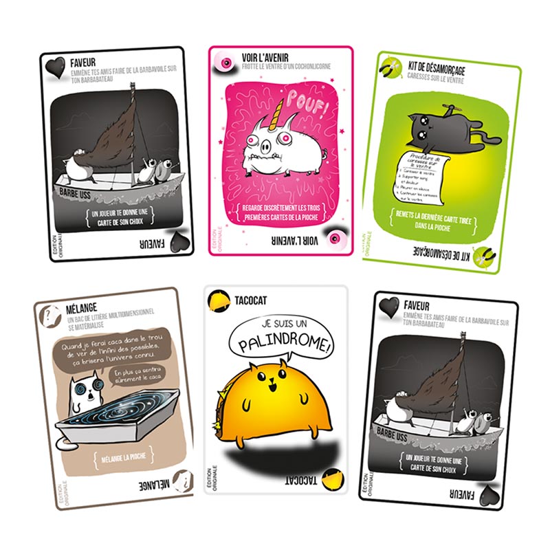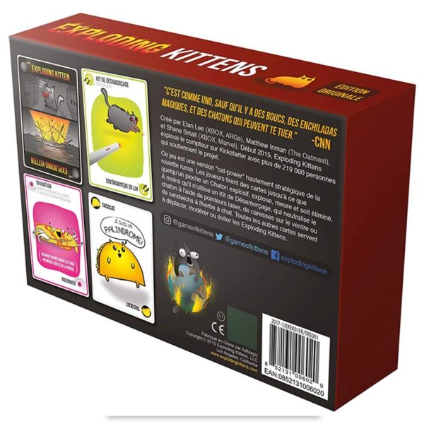 Contenu du jeu : 56 cartes pleines de chat et d’explosions, règles du jeu.