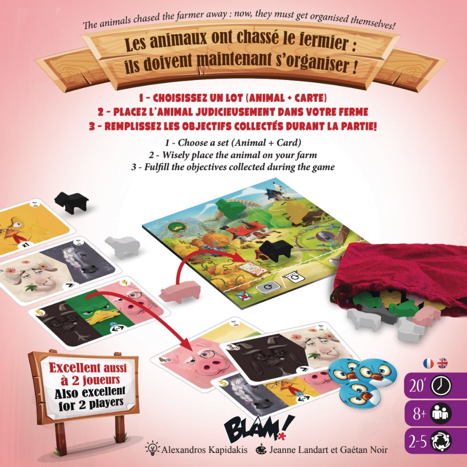 Avec seulement 9 tours de jeu, Farm Club se révèle rapide et demande en permanence du discernement : chaque animal, objectif ou placement influe sur le score final et il convient d’utiliser à bon escient les 2 actions spéciales qui permettent de réorganiser sa ferme ou de renouveler l’offre d’animaux et d’objectifs.