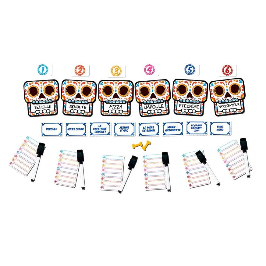 Contenu du jeu : 8 ardoise Crâne ; 8 ardoise Déduction ; 8 feutres effaçables ; cartes Personnage ; cartes Numéro, règles du jeu.