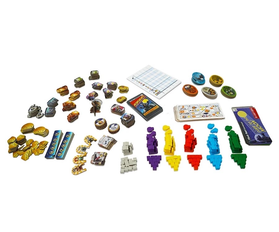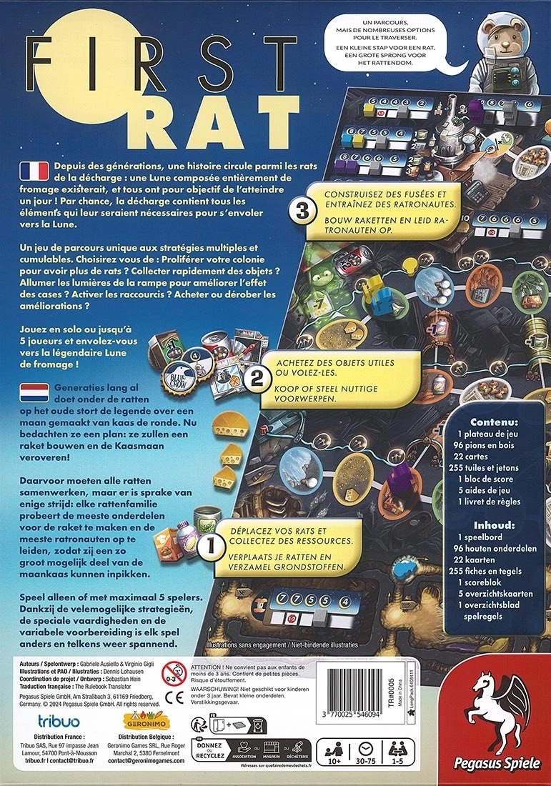 En se déplaçant dans la casse, les joueurs collectent des ressources, achètent (ou volent) des objets utiles, construisent des pièces de la fusée ou entraînent leurs Ratronautes, afin d’accumuler le plus de points de victoire possible. Qui sera le premier rat sur la lune ?