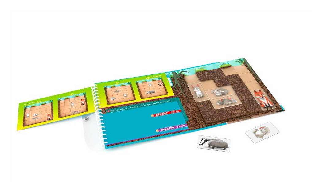 Matériel : 1 plan de jeu aimanté, trois tuiles «Terre» magnétiques, six pièces magnétiques représentant les animaux de la forêt (4 lapins, 1 renard, 1 blaireau), 48 défis et les solutions.