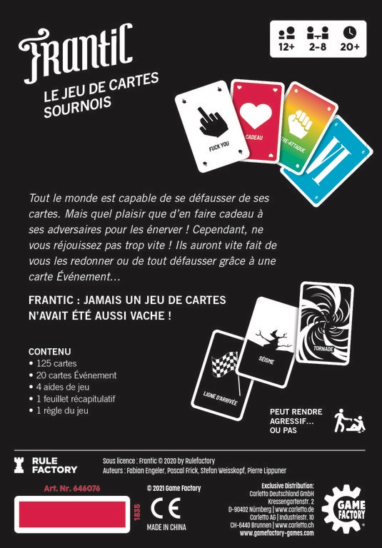 Frantic est un jeu de cartes explosif, fun et… sournois ou chaque tour peut chambouler la partie. Associez couleurs et chiffres… débarrassez-vous de vos cartes aussi vite que possible, tout en utilisant des cartes spéciales pour perturber vos adversaires. Mais sachez que vos camarades de jeu essaient désespérément de vous en empêcher. Des événements imprévisibles rendent chaque partie unique et pleine de surprises. Vous ne pensiez pas que vous pouviez être aussi rancunier ! Attention, ce jeu peut détruire des amitiés.
