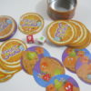 Contenu de la boite métal : 60 cartes fruits, 2 dés, règles du jeu.