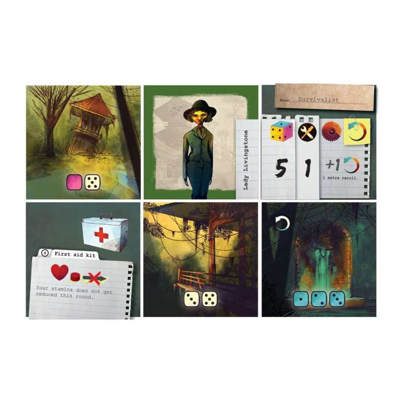 Dans ce jeu coopératif, les joueurs vont jeter leurs dés derrière leur paravent à chaque tour ; ils devront les utiliser au mieux pour parcourir les différentes cartes qui forment le chemin retour vers le village. Mais pour aller sur une carte il faut que les dés remplissent certaines conditions mieux que ceux de vos voisins ! Et comme vous ne connaissez que la valeur de vos dés et que la communication entre équipiersest sommaire, il vous faudra un peu de chance et de la tactique pour ne pas périr !
