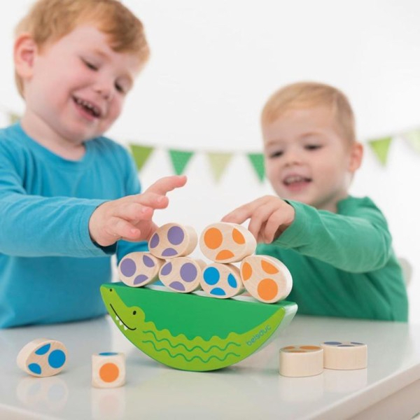 Découvrez Funy Crocodile de Beleduc, un  jeu d’équilibre rigolo où vous devrez empiler les oeufs sur le dos du crocodile à bascule.
