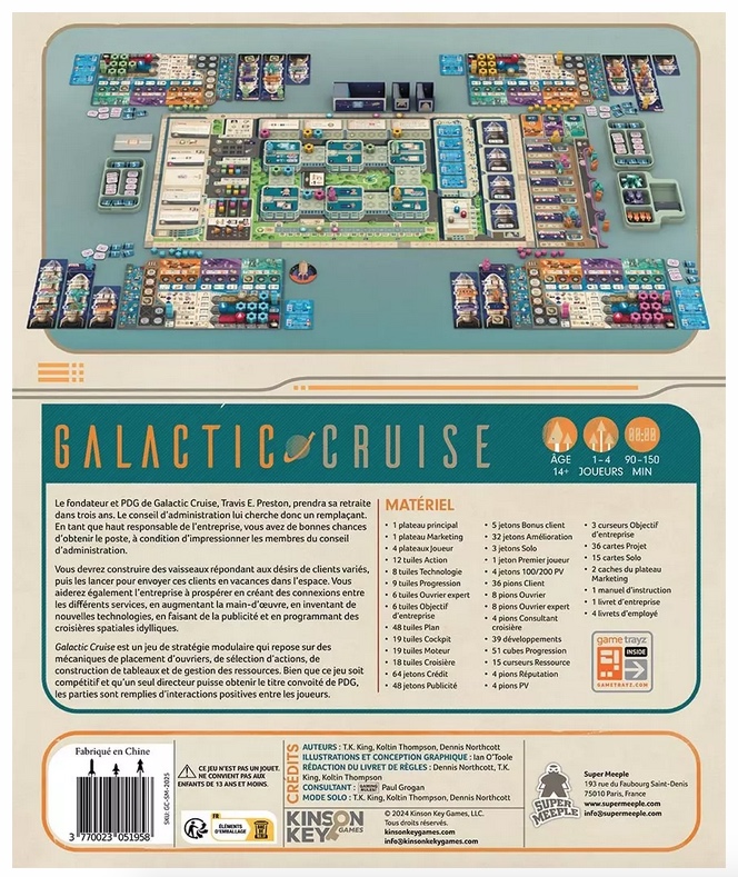 Serez-vous le nouveau Tycoon de la croisière spatiale…? Galactic Cruise est un jeu de stratégie et de gestion . Dans ce jeu de société, devenez le superviseur d’une entreprise proposant des croisières intergalactiques : concevez et gérez vos vaisseaux et participez à une compétition où le meilleur d’entre vous prendra la place du PDG actuel.