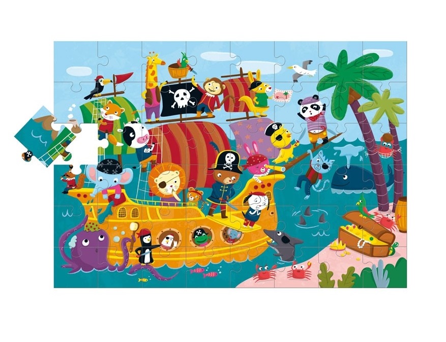 Description : Un puzzle géant format 100 x 70 cm finement illustré d’un voilier pirate et de plein d’animaux en quête du trésor ! Confectionné en carton de grosse épaisseur et avec 48 grandes pièces. Son emballage solide peut aussi servir de boîte pratique.