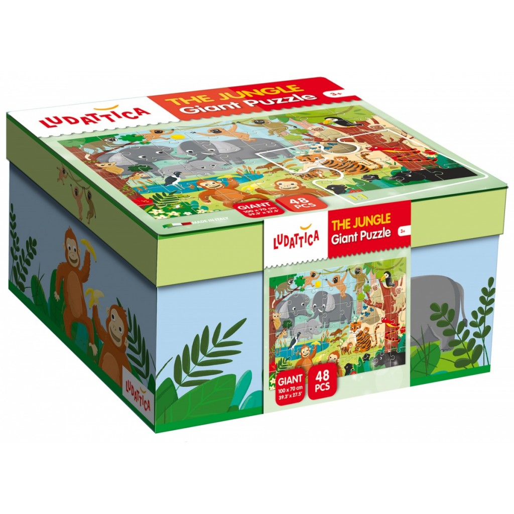 Description : Un puzzle géant avec la belle illustration d’une jungle peuplée de sympathiques animaux ! Réalisé en carton de grosse épaisseur et avec 48 grandes pièces. Le coffret peut également se transformer en une boîte pratique et solide.