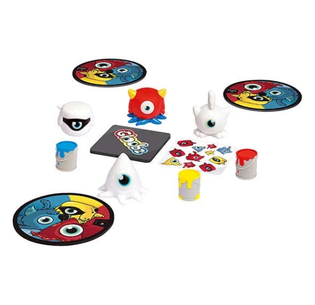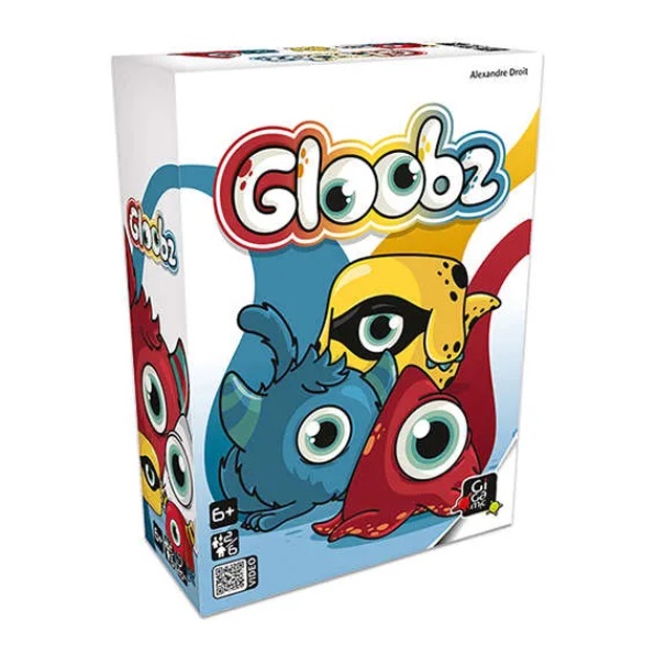 Contenu : 56 cartes Gloobz, 3 figurines Gloobz blanches (carré, rond, triangle), 3 figurines Pots de peinture (bleu, jaune, rouge), 1 figurine Mégagloobz multicolore, 6 disques de score, 1 règle du jeu.