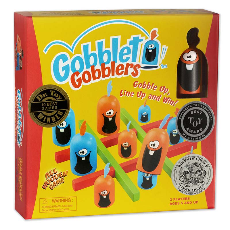 Principe : à chaque tour, mettre en jeu un nouveau Gobblet ou déplacer un de ses Gobblets déjà en jeu. La ruse : « gober » l’adversaire. La finesse : se « gober » soi–même, en vue du prochain coup… L’erreur fatale : « dé-gober » une pièce adverse et faire gagner l’adversaire ! Dès qu’un joueur aligne 3 Gobblets visibles de sa couleur, il gagne la partie.
