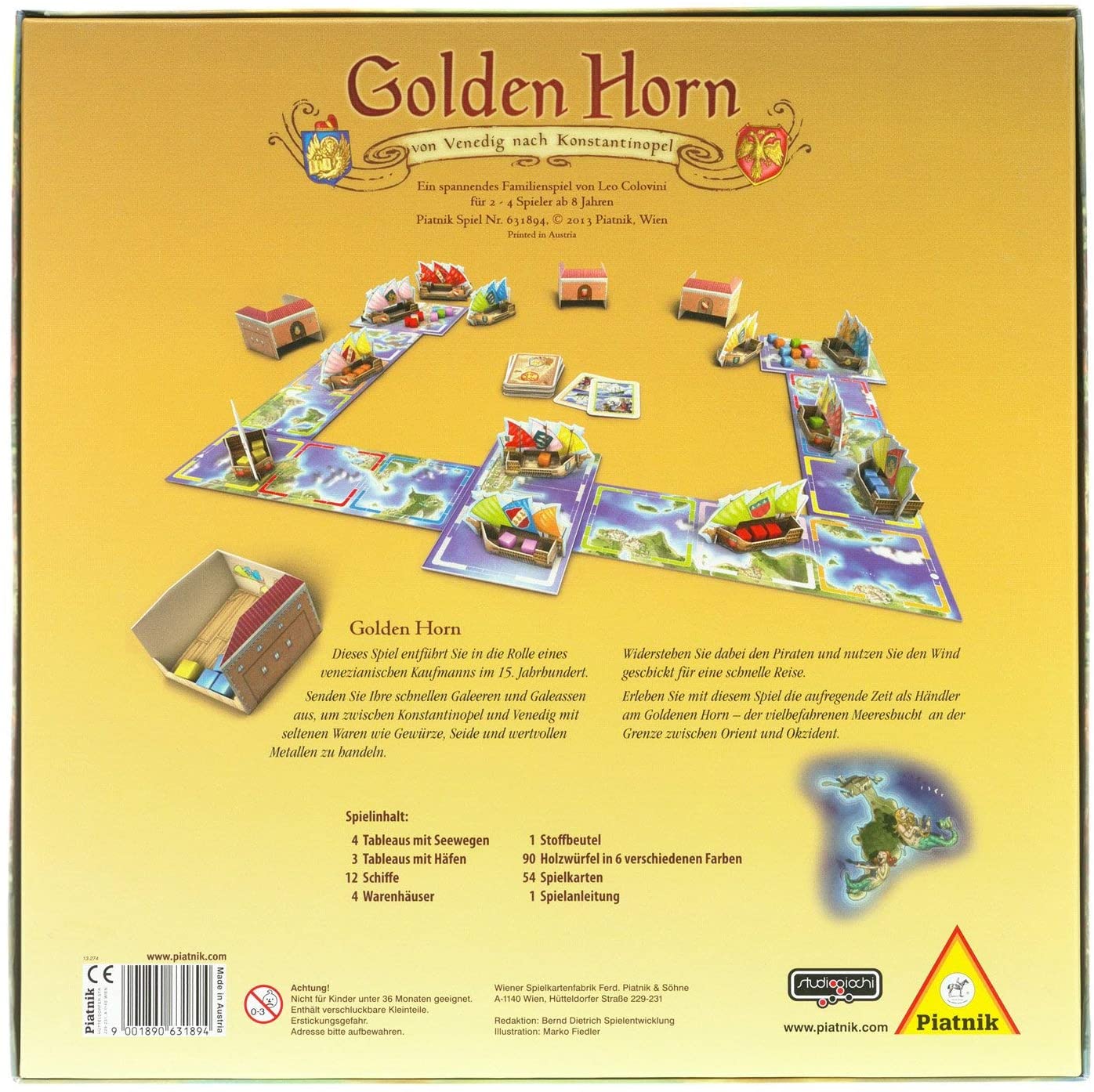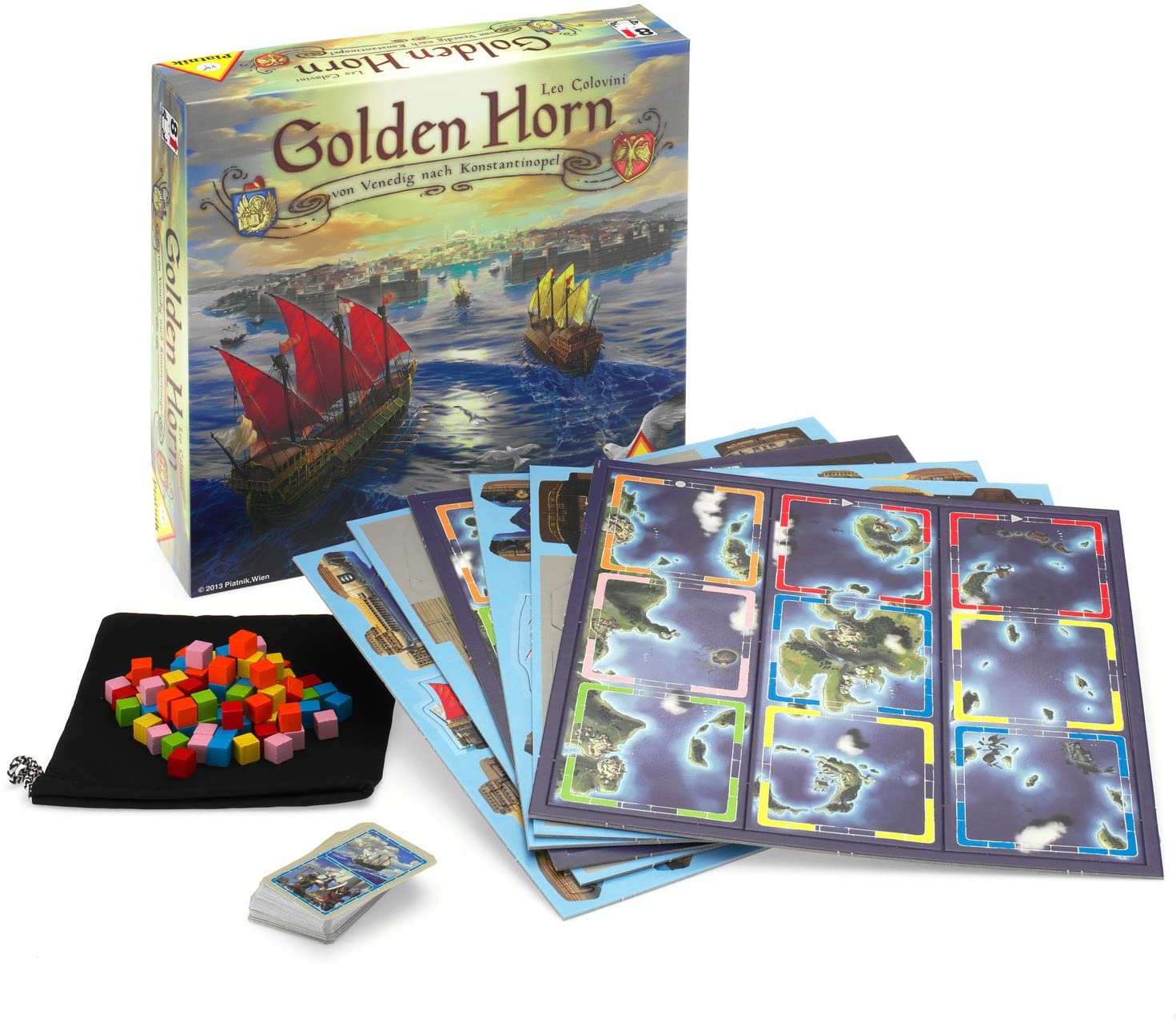 Contenu : 12 bateaux. 4 entrepôts avec blason des joueurs. 60 cubes en bois de couleurs différentes. 3 tuiles ports. 4 tuiles de parcours. 54 cartes. 1 figurine Golden Horn. 1 sac en tissus. 1 règle du jeu.