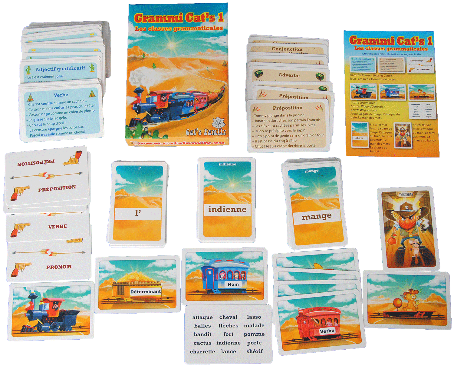 Grammi Cat’s 1 – Les classes grammaticales est un jeu de cartes sur le thème du western, à partir de 7 ans, dynamique et très convivial, mêlant classe grammaticale, analyse, écoute, concentration et rapidité.