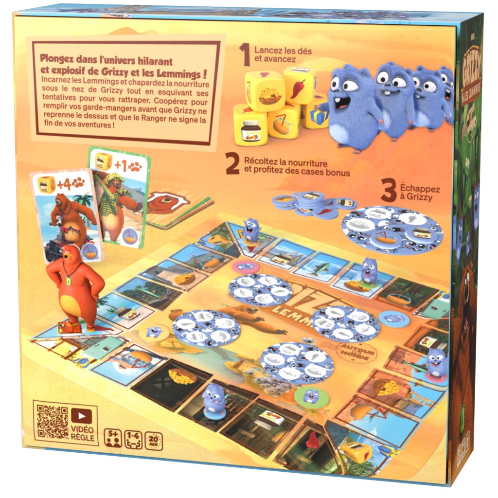 Contenu : 1 plateau, 5 figurines, 5 tuiles garde-manger, 4 tuiles Lemmings, 1 jeton premier joueur, 25 jetons nourriture, 5 dés spéciaux, 15 cartes Grizzy, 1 carte Ranger, 1 règle du jeu.
