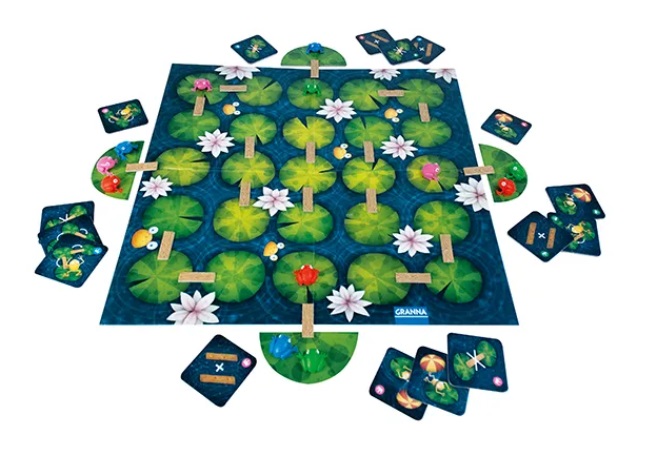 Contenu : plateau de jeu double face, 50 passerelles, 12 figurines grenouilles, 4 nénuphars-maison, 16 cartes spéciales, règles du jeu.