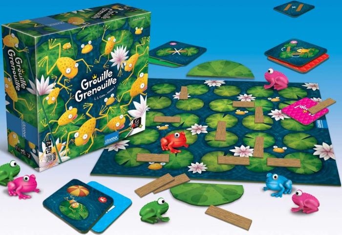 La mouche semble toujours plus savoureuse sur le nénuphar d’à côté, les petites grenouilles l’ont bien remarqué ! Soyez le premier à amener vos trois petites grenouilles sur les nénuphars adverses, mais attention à chaque fois que vous sautez, la passerelle reliant les deux nénuphars disparait, le chemin devient alors plus compliqué. Heureusement vous pourrez en remettre mais vos adversaires pourraient bien en profiter avant vous. Grouille