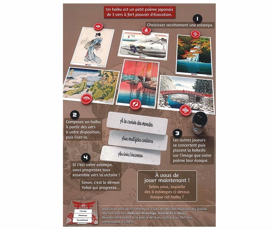 Un Haïku est un petit poème japonais de 3 vers. Il permet d’évoquer les émotions, l’émerveillement, le temps qui passe. Décrivez une estampe aux autres joueurs, à l’aide d’un Haïku. Surpris par la parade des 100 démons (Hyakki yakö), les joueurs tentent de rejoindre leur pagode avant l’arrivée des méchants Yokaïs. Pour se guider les uns les autres, les joueurs doivent créer des haïkus qui tentent de décrire le lieu désiré.