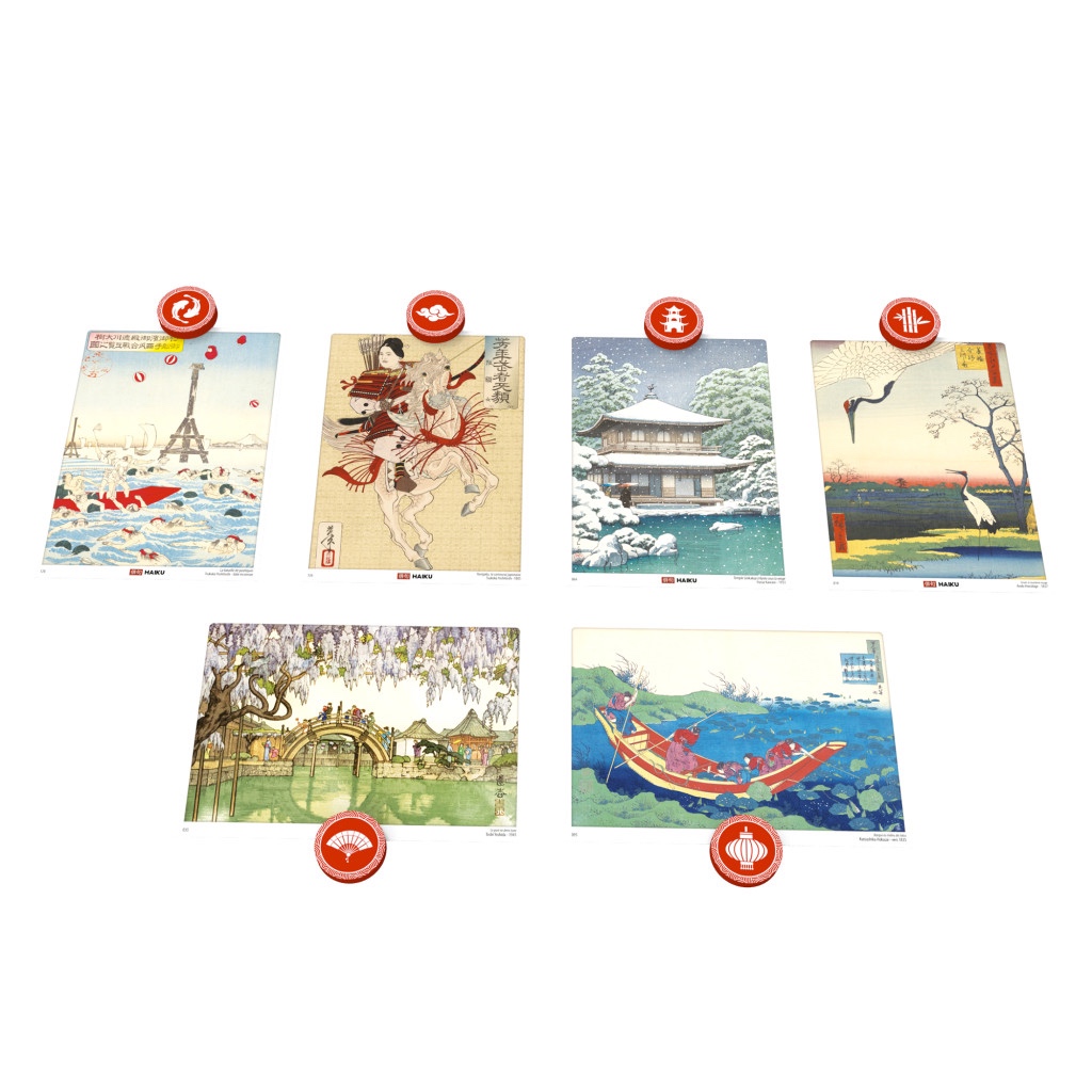 À chaque tour de jeu, 6 estampes japonaises sont présentées aux joueurs. Chacun en choisit une secrètement puis tente de la faire deviner aux autres joueurs en composant un haïku (mini-poème de 3 vers).