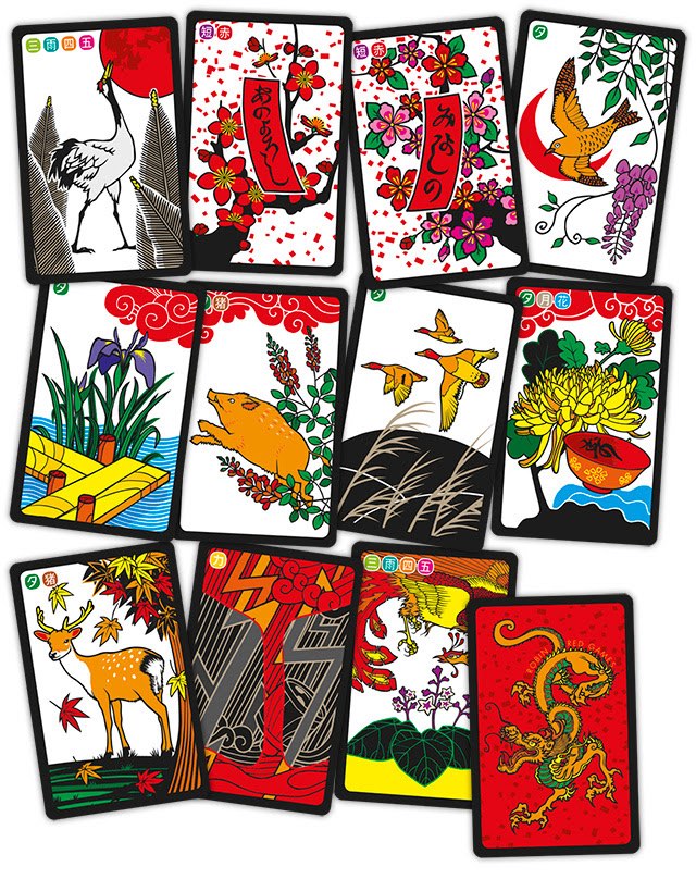 Un jeu de cartes Hanafuda traditionnel dispose de 48 cartes réparties en 12 suites (une pour chaque mois de l’année). Les quatre cartes de chaque mois sont illustrées selon un thème inspiré de la nature et de la culture japonaise. Elles sont très nombreuses à faire référence à des contes, des coutumes ou des anecdotes de l’histoire du Japon.