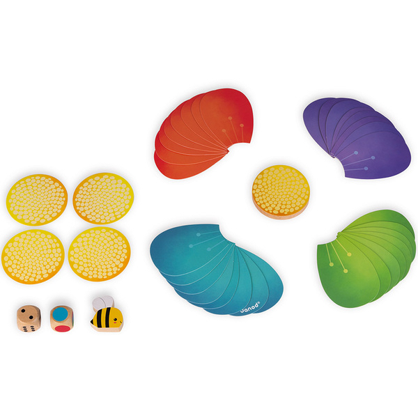 Contenu du jeu : 36 cartes. 2 dés en bois, 1 abeille en bois, 1 coeur de fleur en bois. Règles du jeu en 6 langues.