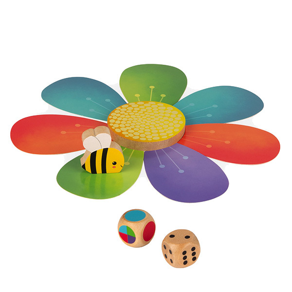 Happy Bzzz de Janod. Oh non ! Les pâquerettes ont perdu tous leurs pétales ! Aidez-vous de l’abeille et des 2 dés pour les récupérer. Le joueur dont la fleur à le plus de pétales a gagné.