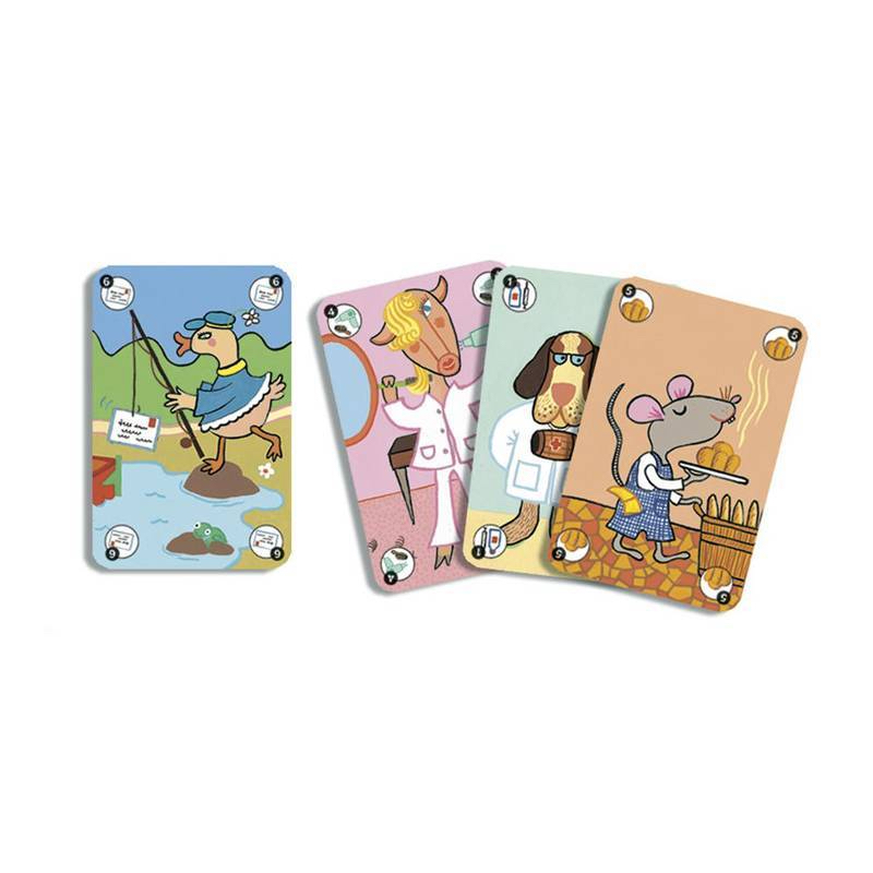 Happy Family de Djeco. Jeu de 7 familles avec des illustrations magnifiques représentant des animaux associés à différents métiers comme le chien docteur, les souris boulanger, chèvre coiffeurs …
