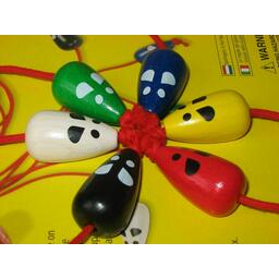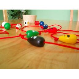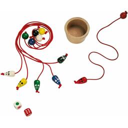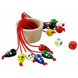 Contenu de la boîte : 6 souris en bois avec des queues en ficelle, 1 gobelet en bois, 1 dé de couleur, 1 dé à chiffres, 1 règle du jeu.