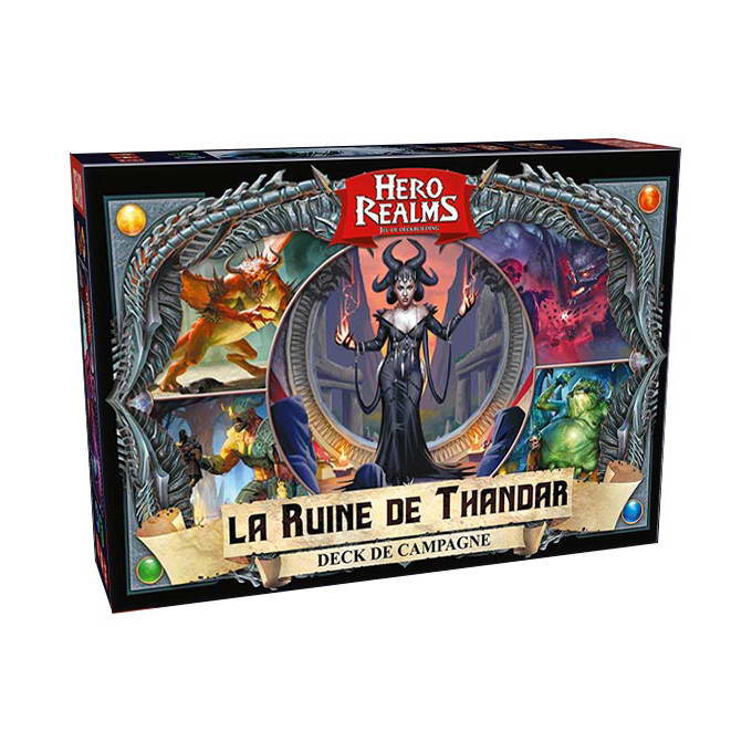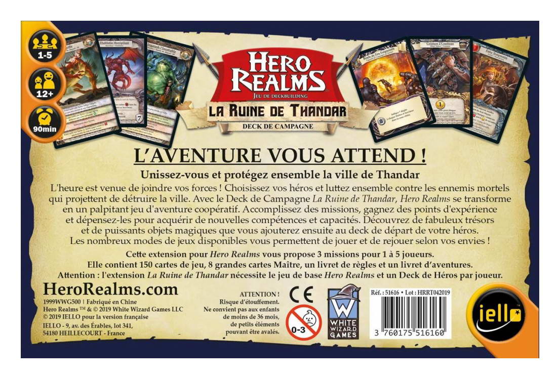 Unissez-vous, Héros, et sauvez la ville de Thandar avant qu’il ne soit trop tard ! Avec le Deck de Campagne La Ruine de Thandar, Heros Realms devient un palpitant jeu d’aventure coopératif ! Munis de leurs Decks de Héros, les joueurs luttent ensemble et suivent les étapes d’un scénario captivant qui les tiendra en haleine pour 3 longues missions. Aux joueurs de savoir exploiter les capacités de chaque Héros pour vaincre les terribles adversaires et pour se protéger les uns les autres. Le scénario évolue en fonction des victoires… et des défaites !