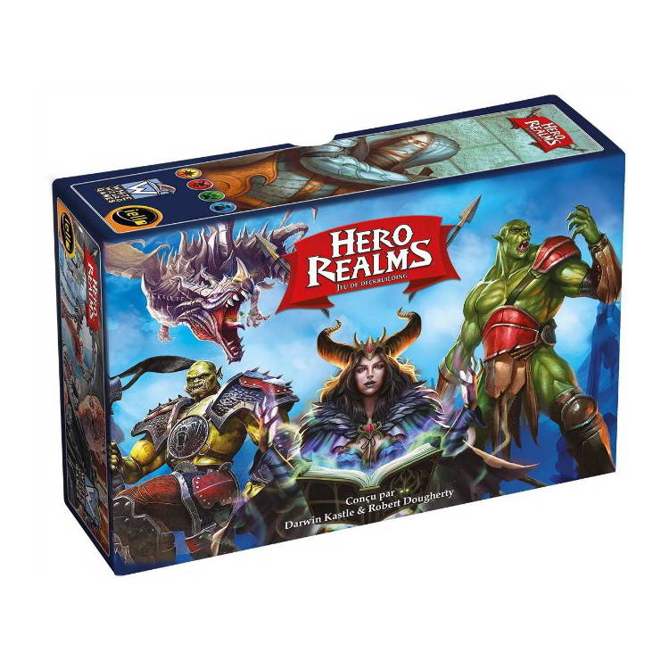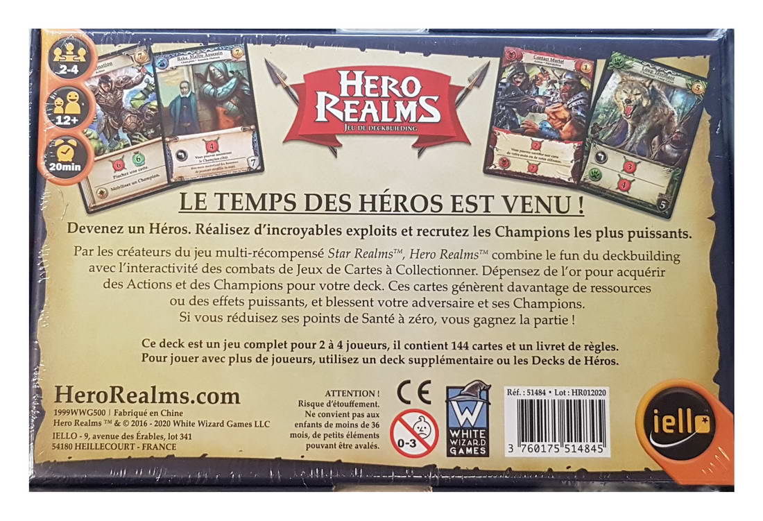 Avec le jeu Hero Realms, devenez un Héros! Réalisez d’incroyables exploits et recrutez les Champions les plus puissants. Par les créateurs du jeu multi-récompensé Star Realms, Héro Realms combine le fun du deckbuilding avec l’interactivité des combats de Jeux de Cartes à Collectionner. Dépensez de l’or pour acquérir des Actions et des Champions pour votre deck. Ces cartes génèrent davantage de ressources ou des effets puissants, et blessent votre adversaire et ses Champions. Si vous réduisez ses points de Santé à zéro, vous gagnez la partie !