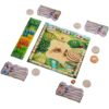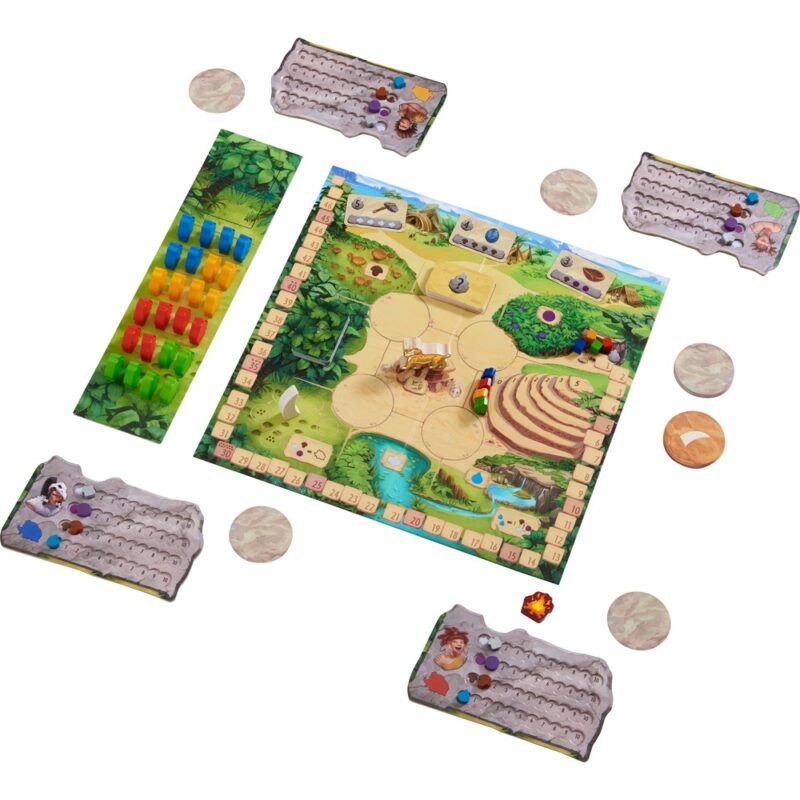 Contenu du jeu : 1 plateau de jeu, 1 plateau de dépôt, 5 cartons de marquage, 46 cartes d’action rondes (28 grises et 18 rouges), 25 cartes bonus, 32 cartes de troc, 1 pion  » feu  » pour indiquer le premier joueur, 1 défense de mammouth, 1 figurine Honga, 30 mammouths, 5 hommes préhistoriques, 5 pierres de classement, 20 marqueurs  » matière première  » (5 poissons, 5 baies, 5 champignons, 5 gouttes d’eau), 1 règle du jeu.