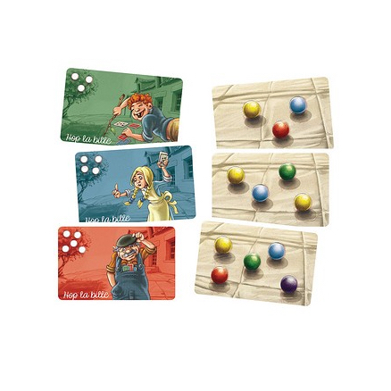 C’est parti… Hop… La bille ! Les cartes sont sur la table, nos billes judicieusement disposées dans la cour de récré. L’œil est vif et les doigts bien dégourdis… La partie peut commencer ! Le but du jeu ? Avoir dans notre camp les billes nécessaires pour valider les combinaisons de nos cartes. Comment ? En faisant des pichenettes ! Il va falloir être à la fois stratégique et habile pour gagner les bonnes billes des adversaires en les touchant, tout en surveillant leurs jeux pour les empêcher de l’emporter…