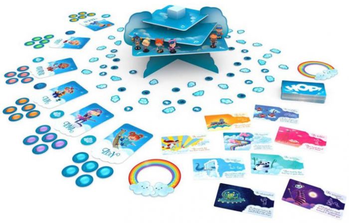 Contient : 1 plateau de jeu représentant le ciel (2 étages par plateau et un sommet), 6 figurines , 6 plateaux Personnage, 6 jetons Pari recto/verso (Content /Pas content), 30 ballons de 6 couleurs différentes (5 par couleur), 30 jetons Oiseau recto-verso : Colombe/Corbeau, 36 jetons Nuage recto-verso : nuage/chiffre (de valeur 0 à 2), 50 cartes Gage , 2 Arcs-en-ciel