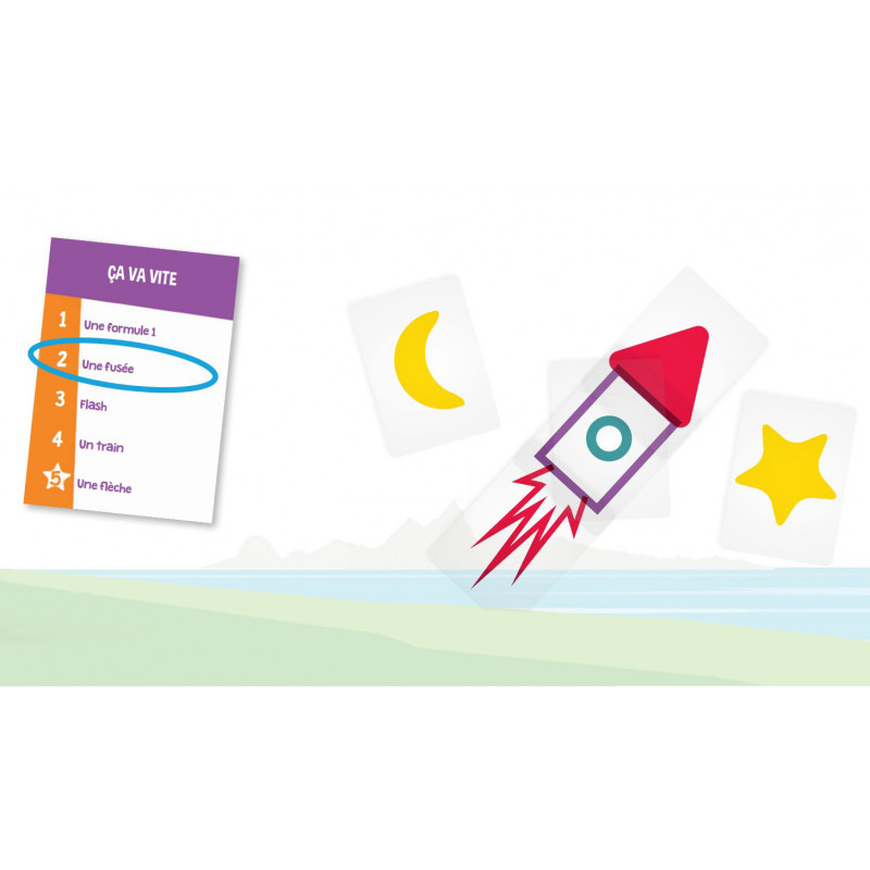 Imagine revient dans un format famille toujours aussi immédiat dans le divertissement et le plaisir : piochez une carte Devinette, choisissez un sujet parmi les cinq possibles, et faites-le deviner aux membres de votre équipe à l’aide des calques.