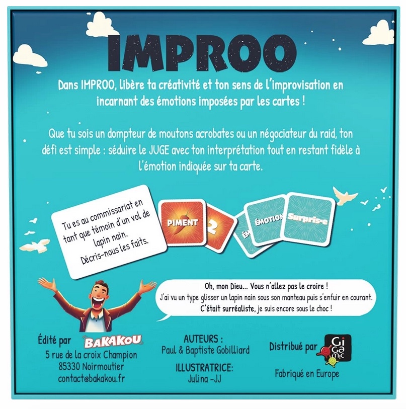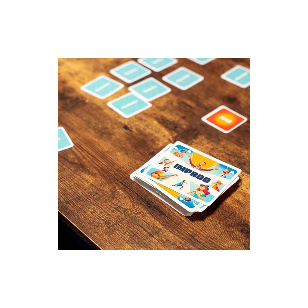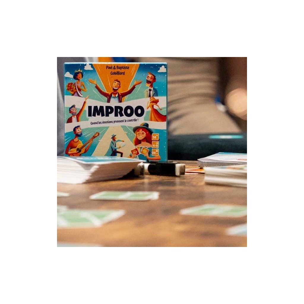Improo est un jeu d’ambiance simple et fun, où vous devrez improviser un personnage dans des situations loufoques tout en restant fidèle à l’émotion indiquée sur la carte !