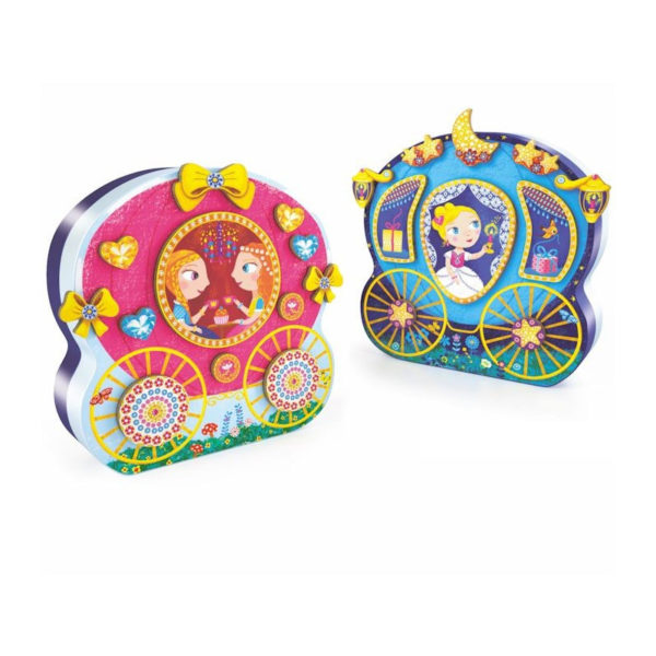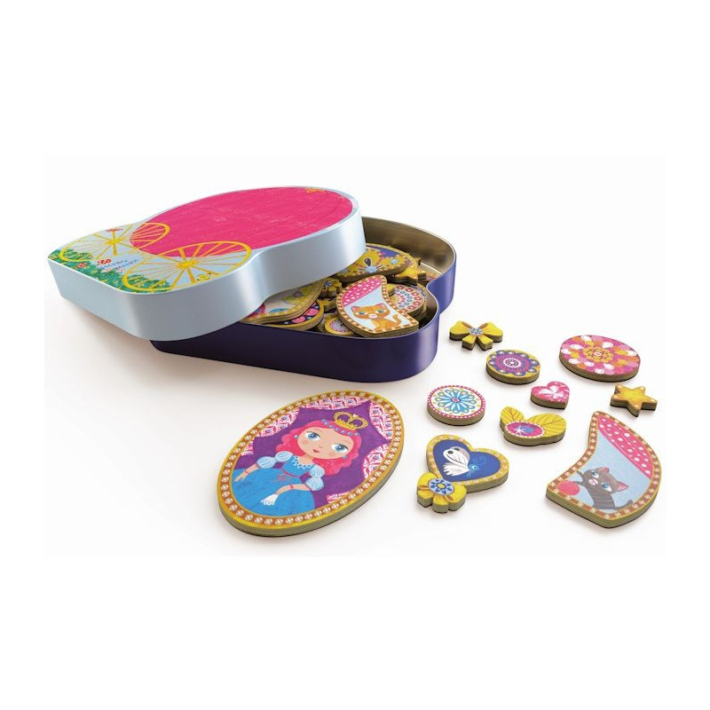 Cette boite métallique en forme de carrosse renferme 47 pièces en bois magnétiques (princesses, bijoux, animaux, coeurs, rubans, étoiles, …) à placer sur les faces de la boite pour créer des aventures enchantées.
