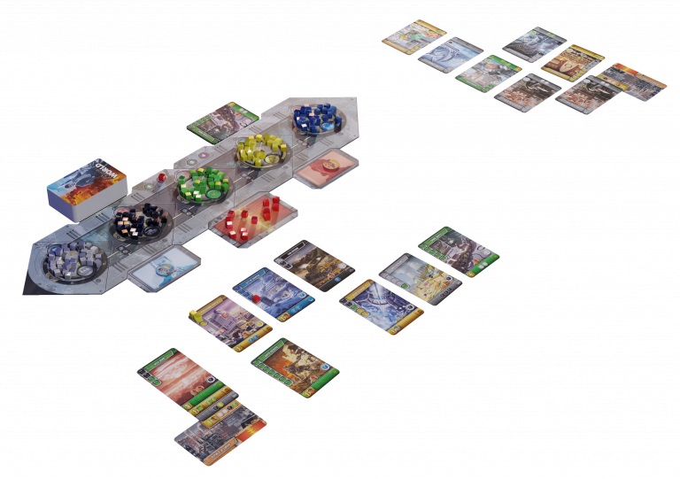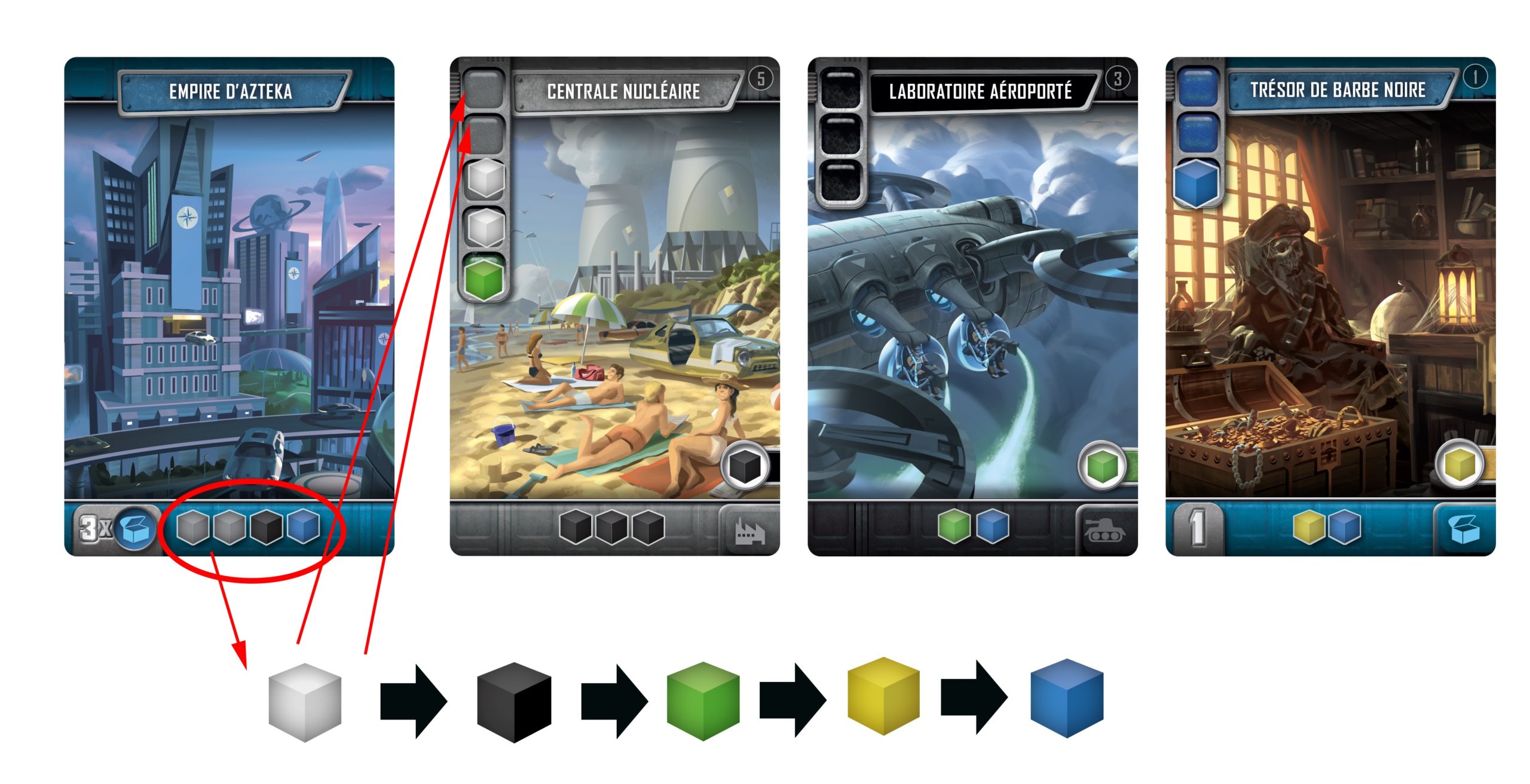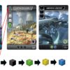 À la fin de chaque manche, les cartes construites dans votre Empire vont produire des ressources, mais selon un ordre prédéfini. Maîtriser cet ordre est crucial pour planifier l’ordre de construction de vos cartes, et ainsi optimiser votre développement ! À la fin de la 4ème manche, le joueur avec le plus de Points de Victoire gagne la partie.