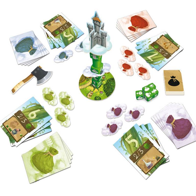 Empilez ensuite vos dés afin de faire pousser le haricot magique. Plus il sera haut, plus il sera difficile pour vos adversaires d’empiler leurs dés sans faire chuter le haricot ! Si un joueur fait tomber la pile de dés formant le haricot, ses adversaires pourront alors voler des sacs d’or au Géant !