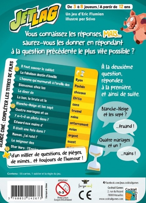 Jet Lag… Pour gagner, répondez à côté ! Vous connaissez les réponses de ce drôle de Quiz, mais saurez-vous les donner en répondant à la question précédente ? Un jeu délirant et complétement décalè… rires garantis !