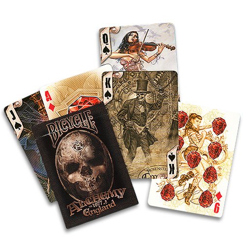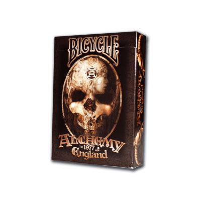 Contenu : Paquet de 54 cartes à jouer « Alchemy 1977 England » de la marque américaine Bicycle. Étui cartonné, Cartes avec un dos crane.